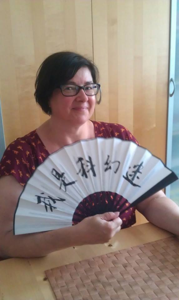 于是,一年之后,2014年8月,又一年赫尔辛基暑期学校,我们在课堂上再见,我送给她一把写着中文的扇子——“我是科幻迷(I am a science fiction fan)”。