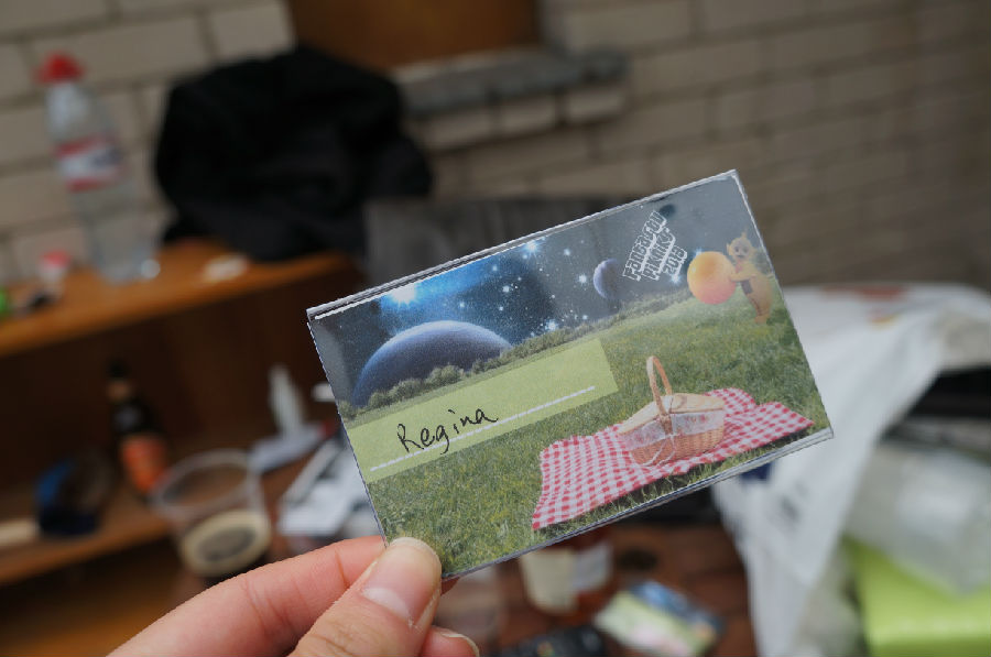 Martins告诉我,这次野餐总共有二十多个人报名,大多是常来活动的熟人,也有从未谋面的新人。他和Liga为每一位参加者准备了名牌,群星照耀下的草地上铺着红白方格野餐布,草编的野餐篮压在布上,远处竟站着个天线宝宝。名牌上用拉脱维亚语写着“幻想圈的野餐2013”,名字则要参与者自行填写。