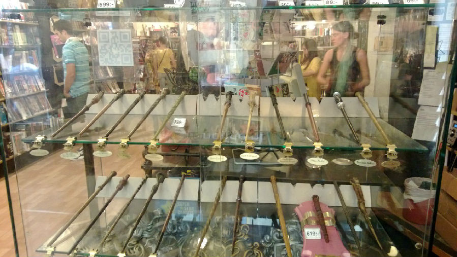 推开店门,满目是书。当然啦,这是一家书店。我沿书架一排排看过去,寻找自己熟知的名字,从托尔金到马丁,阿西莫夫到PKD,满满当当全部是科幻奇幻书,瑞典语和英语分开陈列。往深处走,我又看到了英文版的日本漫画,不乏《铳梦》和《20世纪少年》这样足以让科幻迷尖叫的作品,店堂深处是影碟区,摆着各种科幻奇幻电影剧集的DVD和蓝光碟,也有日本动画。影碟区之上,二楼阳台上,赫然展示着星战cos服装!往店堂另一边绕出来,可以看到不少杂志,柜台旁竟还有卖哈利·波特里的魔杖。我还在书架间流连时,Pebbles已经抱着一本书去柜台结账了,柜台后的黑板上画着一条龙,怀抱图书就如怀抱珍宝。她是这儿的常客,和店员很熟。在她排队买单的间隙,我和她的店员朋友聊了几句,得知科幻书店的发起人也是几位幻迷,因为喜欢科幻所以想开一家书店,没想到生意越来越好。在瑞典,虽说也有一群坚定的硬核科幻迷,但大众消费层次的科幻奇幻等等推测性文学和动漫影视之间并没有那么大鸿沟,引入各种类型的商品后书店生意蒸蒸日上,不久便成了一家全国连锁店。